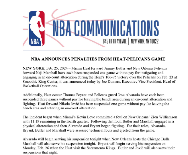 来源:JRS直播网02-26 14:04JRS直播网02月26日讯 ,NBA官方正式公布热火和鹈鹕冲突的罚单,巴特勒、马绍尔禁赛1场,约维奇停薪禁赛1场,阿尔瓦拉多和托马斯-布莱恩特停薪禁赛3场;5人累计禁赛9场,损失金额超过37万美元,巴特勒一人损失接近26万美元。