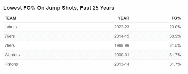 数据说明了他们的投篮有多么糟糕。赛季至今,湖人118次三分出手,只有21.2%的命中率。他们的跳投命中率只有23%,整体命中率也只有40.7%。自2014-15赛季的76人队以来,没有一支球队的整季命中率低于41%,而当时那支76人是为了摆烂这么做的。