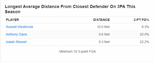 另有数据显示,在167名本季至少出手10次三分球的球员里,威少和浓眉是被放距离最长的。威少的对手防他三分的距离平均是10英尺(3.048米),威少的三分命中率只有8.3%,浓眉对手防他三分的平均距离是9.6英尺(2.93米),浓眉的三分命中率也只有20%。