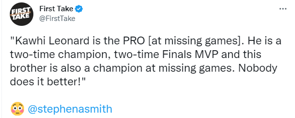 对于小卡开赛4战休战2场,也就是打一场歇一场,名嘴A-史密斯炮轰小卡,他表示:现在莱昂纳德仅仅打了两场比赛,又开始缺阵了,这太荒谬了。莱昂纳德在缺席比赛方面可是专业的。他是两次总冠军、两次总决赛MVP得主,同时也是缺席比赛的冠军,在这方面没人比他做得更好。