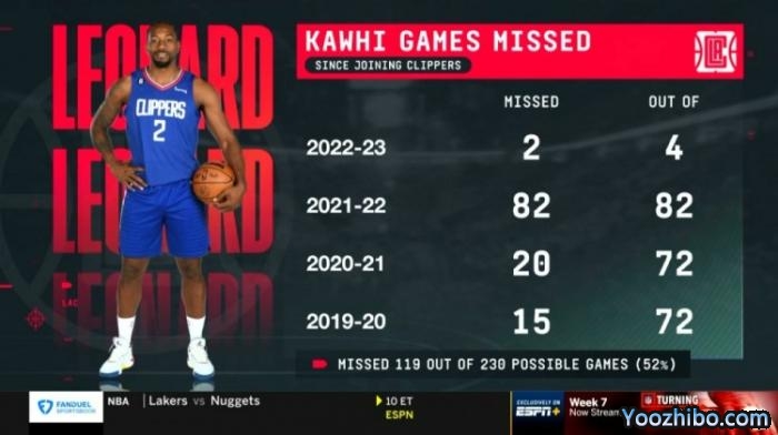 在所有的230场比赛中,莱昂纳德累计缺战了119场,缺战率达52%。