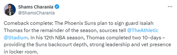 shams报道称,在他的第12个NBA赛季,托马斯用两个10天合同,为太阳队提供了后场深度、强大的领导力和更衣室老将的存在感,最终让他完成了自己的复出计划。