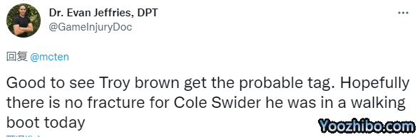 湖人射手斯威德的伤势令人担忧,据美记者报道,今天训练时斯威德的右脚上穿着保护靴,上一场对阵快船他因伤休战;医学专家Evan Jeffries发推表示:很高兴能够看到布朗被列为大概率出战,希望斯威德没有遭遇骨折,因为他今天穿着保护靴。