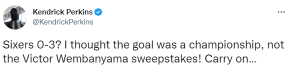 名嘴帕金斯吐槽76人,发推写道:76人开季三连败?我本以为你们的目标是冲击冠军,而不是参与文班亚马大抽奖。