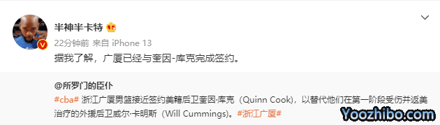 据报道,广厦签约库克是用他代替他们在第一阶段受伤并返美治疗的外援后卫威尔-卡明斯;今夏库克曾与国王签下一份无保障合同,仅为国王打了2场季前赛,场均上场9分钟拿到6.5分1篮板1助攻,三分命中率40%;但新赛季开打前,库克被国王裁掉从而再次失业。