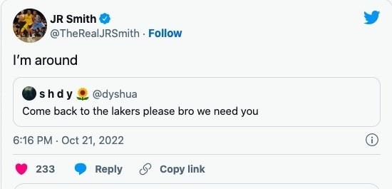 湖人的阵容缺陷很多,不仅锋线缺人,而且缺少稳定的三分投手;有球迷喊话JR-史密斯:回来湖人吧,求求你了兄弟。我们需要你。JR回复道:我就在你们身边。