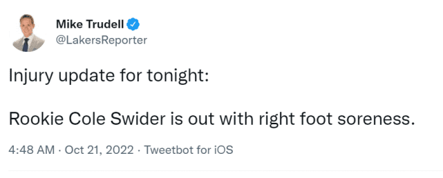 不过,斯威德的缺阵,应该不会影响湖人的正常轮换。上一场揭幕战,斯威德只打了两分钟,湖人当时派出的首发是威少、贝弗利、沃克、詹姆斯和浓眉。
