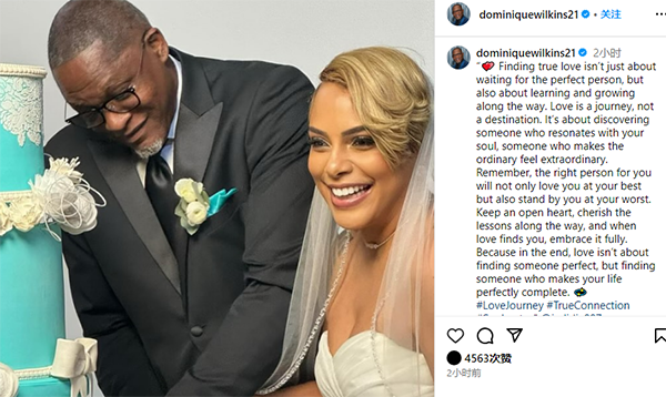 威尔金斯晒出自己和新娘的合照,并动情写道:寻找真爱不仅仅是等待那个完美的人,还需要在这个过程中学习和成长。这是一段旅程,而非目的地。这是关于发现一个能和你灵魂产生共鸣的人、一个能化平凡为非凡的人。请记住,对的人不仅会在你处于山巅时爱你,也会在你处于谷底时支持你。保持一颗开放的心,珍惜一路走来所学到的东西。当真爱降落,全力去拥抱它。因为到最后,爱情不是让你找到一个完美的人,而是找到一个让你的生活变完美的人。
