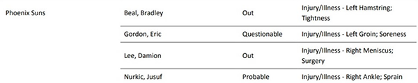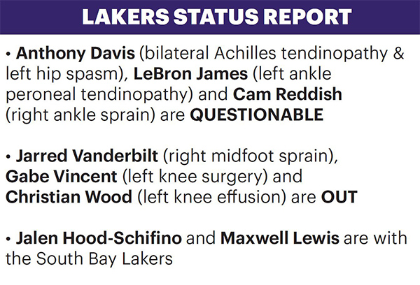 詹姆斯(左脚踝腓侧肌腱炎)、安东尼-戴维斯(双侧肌腱炎;左臀痉挛)和雷迪什(右脚踝扭伤)都被列为出战成疑,50%可能性出战;伍德(左膝积液)、范德比尔特(右中足扭伤)、盖布-文森特(左膝手术)、席菲诺(下放至发展联盟)和刘易斯(下放至南湾湖人)都将缺席比赛。