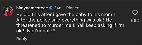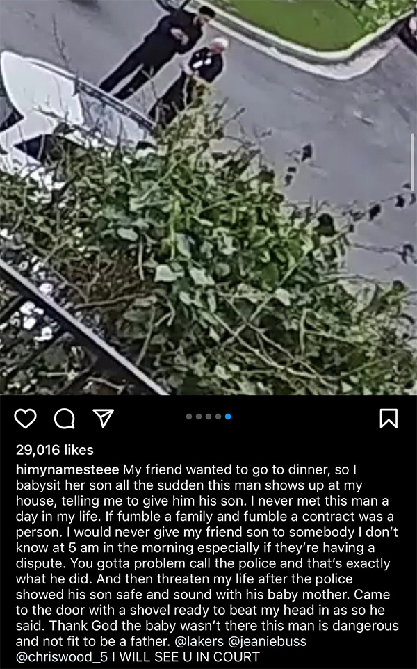 名叫塔玛拉-基森(INS上拥有229万粉丝)的女子通过社媒发布伍德出现她家的视频,并且表示:我的朋友要去吃饭,所以我照顾她的儿子,突然有个男人出现在我家,让我把他的儿子给他。我一辈子都没见过这个人。我绝不会在凌晨5点把我朋友儿子交给一个我不认识的人,尤其是当他们有争执的时候,你得报警。在警察证明他儿子和他孩子的母亲安然无恙之后,他威胁我的生命。拿着铲子来到门口,准备照他说的打我的头。感谢上帝,当时孩子不在那儿,这个男人很危险,他不适合做父亲。