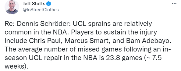 另一医学专家Jeff Stotts表示,拇指尺侧副韧带撕裂的伤病在NBA比较常见,克里斯-保罗、斯玛特和阿德巴约都曾遭遇类似的伤病,按照以往的情况,接受UCL修复手术后,平均缺席23.8场比赛(大概缺席7.5周)。