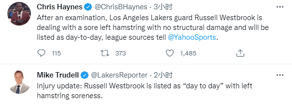 来源:JRS直播网10-17 14:44JRS直播网10月17日,湖人巨头威少的腿筋检查结果出炉,据名记Chris Haynes报道,威少的左腿筋无结构性损伤,仅仅只是左腿筋酸痛,进入每日观察名单;另外据报道,新赛季常规赛威少会继续替补。