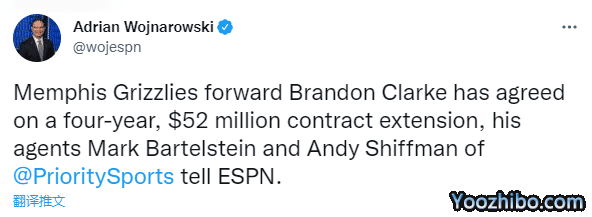布兰登-克拉克也是在提前续约截止日前续约的,和灰熊新签4年5200万美元新合同,平均年薪1300万美元;沃纳罗斯基还表示:克拉克已经成为灰熊队另外一位重要的年轻球员。