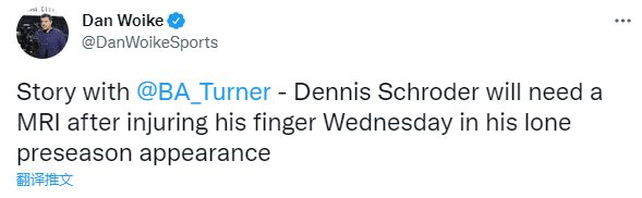 湖人随队记者Dan Woike跟进报道,施罗德是在上一场对阵森林狼的比赛期间手指受伤的,他将接受MRI检查。