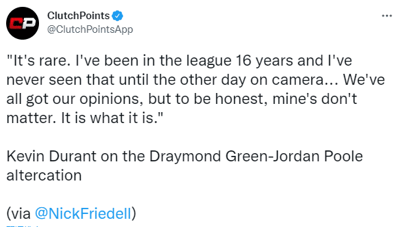 对于格林拳击普尔的冲突事件,杜兰特正式回应,KD接受采访时说了很多话,表示:这次的情况与我和追梦的那次不一样。这次有人的脸被打了,两者完全没有可比性。