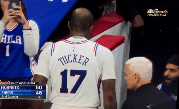 第二节1分47秒,恩比德在篮下摔倒,倒地时撞到了PJ-塔克,恩比德撞到了头部,PJ-塔克则是坐在地板上,抓着小腿十分痛苦,两人的反应都十分痛苦;之后恩比德继续留在场上比赛,但塔克缓慢离场并且一瘸一拐返回更衣室。