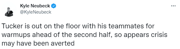 上半场76人48-56落后黄蜂8分,塔克离场前首发上场13分钟0分3篮板1助攻1抢断,没有获得出手机会;据费城记者Kyle Neubeck报道,塔克下半场继续和队友们一起热身,继续首发出战,看来已经避免伤病危机;换言之,塔克的小腿无碍,不过这一幕真是太惊险了。