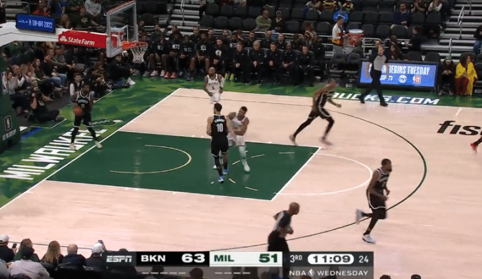 西蒙斯下场后,杜兰特和欧文两大巨星开火,连中三分把领先优势扩大到将近20分;西蒙斯重新上场,倒地拼抢地板球被吹犯规;杜欧单节合砍20分,三节打完篮网领先17分;末节两队首发继续打,为常规赛提前练兵,篮网三巨头早早打卡下班,字母哥仍旧继续打,雄鹿输掉比赛。