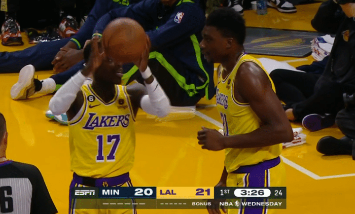 湖人比赛细节:威少和对手纠缠吃T 浓眉球裤破洞37岁詹皇单手劈扣