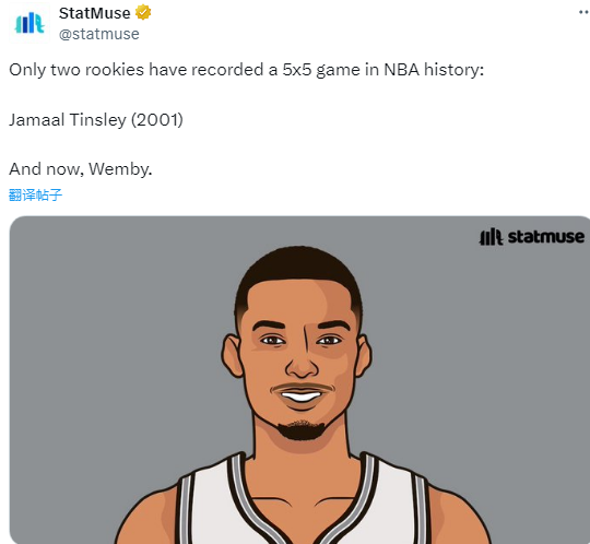 3、20岁51天的文班亚马就此成历史最年轻5X5先生,并把这个纪录提前了两岁,之前的纪录保持者是22岁零288天的基里连科。