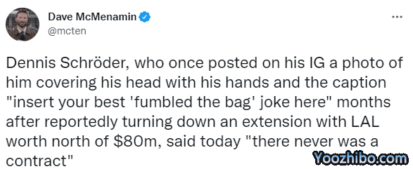 2020-21赛季,施罗德曾为湖人效力,外界曾报道施罗德拒绝了湖人为他提供的4年8000万美元续约合同;对此,施罗德今天公开回应:湖人从未给我提供这样一份合同。