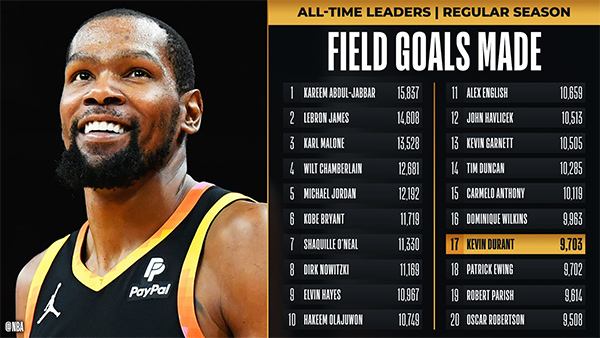 杜兰特总分超甜瓜升到历史第9!连超名宿破纪录:本季有望达成3万分
