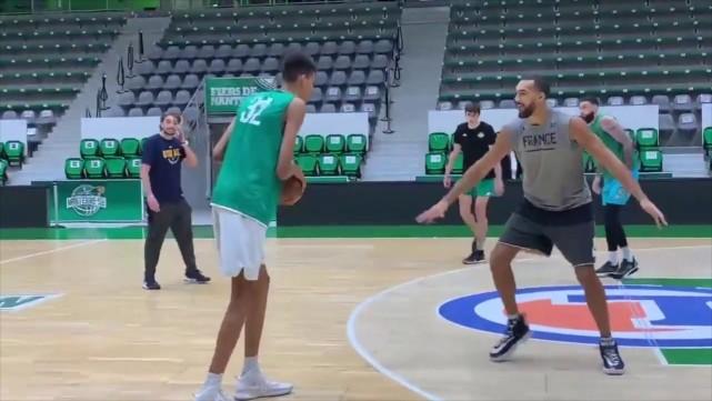 在这段拍摄于2020年10月的视频中,16岁的文班亚马明显比现在更瘦一些。第一球,他在戈贝尔面前直接中投得分,戈贝尔看上去没有太认真防守,只是象征性地干扰一下,球应声入网。第二球,戈贝尔认真了,文班亚马再次跳投时,戈贝尔努力封盖,但球依然命中。
