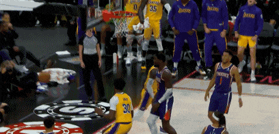 第三节4分11秒,纳恩助攻达米安-琼斯上演精彩的双手砸扣,琼斯暴扣点燃替补席,湖人众球员站在场边疯狂庆祝,结果湖人替补席吃到一个技犯,对此湖人主帅哈姆摊手不满,詹姆斯、威少和浓眉等球员都对女裁判的吹罚很不满,詹姆斯被威少逗得捂脸大笑,威少摇手指抱怨抗议,浓眉身穿一件绿色外套十分抢镜,赛前浓眉因背部紧张而休战。