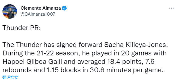 根据雷霆队记Clemente Almanza报道,雷霆官方已经宣布,他们已经签下前锋萨卡-琼斯。在21-22赛季,他为以色列球队Hapoel Gilboa Galil出战20场比赛,场均上场30.8分钟,能够得到18.4分7.6个篮板和1.15次盖帽。