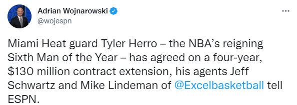 据名记Woj报道,经纪人透露,希罗已经同意与热火签下一份4年1.3亿的续约合同。