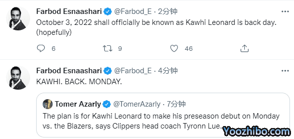 来源:JRS直播网10-01 10:19JRS直播网10月01日讯 ,NBA季前赛已经开打,在快船新赛季第一场季前赛之前,快船主帅泰伦-卢宣布科怀-莱昂纳德将在下一场对阵开拓者的比赛中伤愈归来,因此小卡伤愈复出首战的时间确定,3天后正式重返赛场;沃尔也将在这一场比赛中回归。