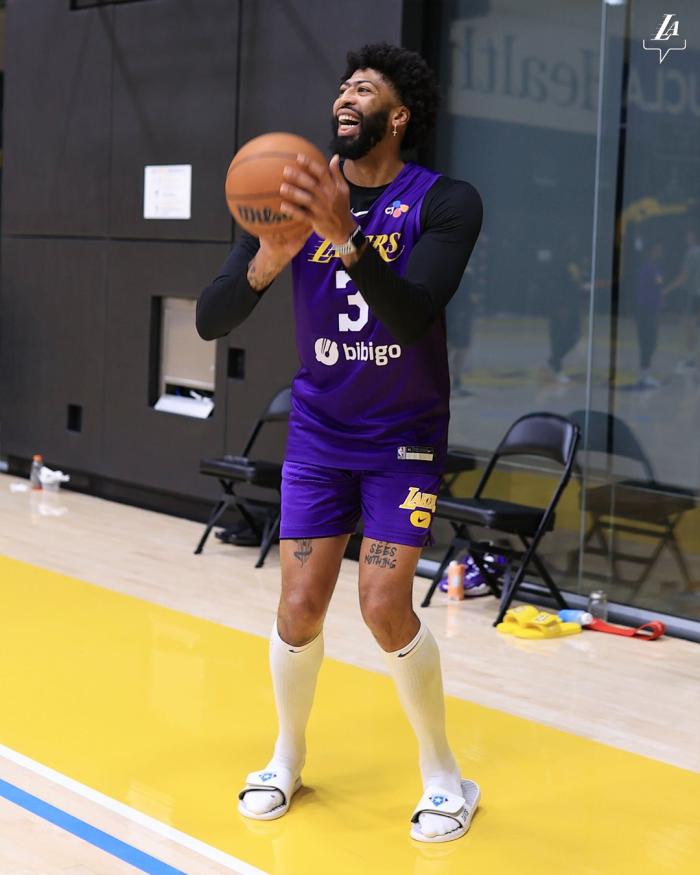 湖人官方晒三巨头训练照:詹皇赤脚威少大笑 浓眉已准备好担任新领袖