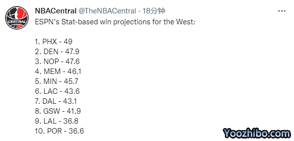 ESPN预测西部球队的新赛季战绩,具体情况如下: