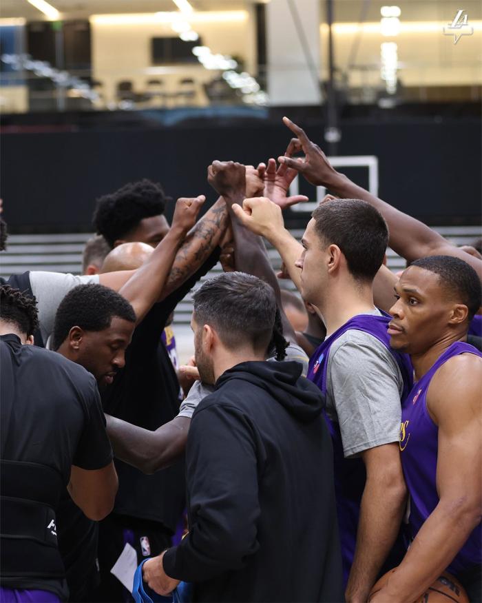 来源:JRS直播网09-28 10:51JRS直播网09月28日,洛杉矶湖人队正式举办训练营,首日训练之后湖人官方晒出训练照,配文写道:训练营第一天;浓眉单挑詹姆斯,两大巨头的表情抢镜;威少抱球目视远方,加布里埃尔满脸笑容,训练之后众球员围在一起击拳加油。