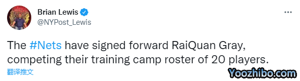 来源:JRS直播网09-27 15:34JRS直播网09月27日,据名记Brian Lewis报道,篮网已经签下前锋雷匡-格雷,双方签下一份训练营合同;篮网训练营20人大名单出炉,杜兰特、欧文和西蒙斯新三巨头领衔15+2冲冠阵容。