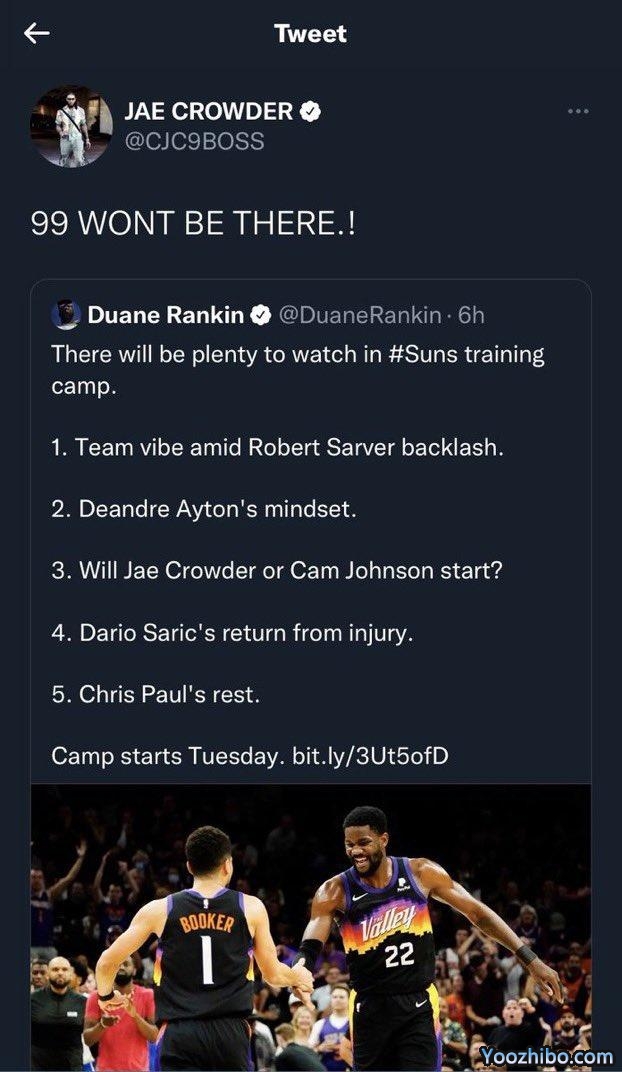 太阳记者Duane Rankin发推写道:太阳训练营值得关注的地方:萨沃事件后的团队氛围、艾顿的心态、克劳德或者卡梅隆-约翰逊会首发吗?萨里奇伤愈复出和保罗的休整;克劳德转发该动态,并且写道: