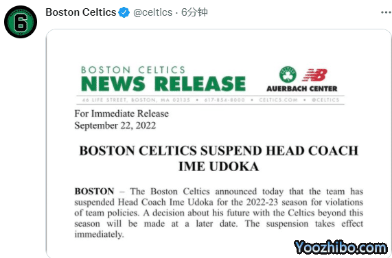 来源:JRS直播网09-23 11:04JRS直播网09月22日日,凯尔特人官方正式宣布,乌度卡因违反球队纪律,被球队禁赛整个2022-23赛季,禁赛立即生效;绿军主帅乌度卡因出轨女职员被停职一年,之后乌度卡公开道歉并且表示接受球队的处罚;乌度卡被禁赛整个赛季,乔-马祖拉将担任凯尔特人临时主帅。