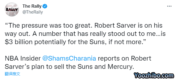 此前太阳老板正式宣布开始为太阳寻找买家;shams在节目中报道:萨沃本不想走到出售球队这一步,但是外界过大的压力让他不得不做出这个决定。除了来自社会各界的压力外,包括詹姆斯、保罗在内的球星发声也让萨沃无法继续冷处理该事件。