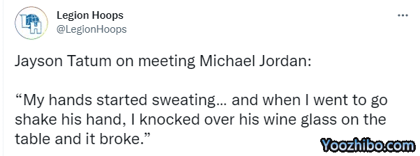 塔图姆自曝与乔丹见面时的经历,自曝:当我见到乔丹时,我的手就开始冒汗了;然后当我走近他要跟他握手时,我紧张到撞翻了他的红酒杯,而且酒杯还摔碎了。