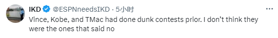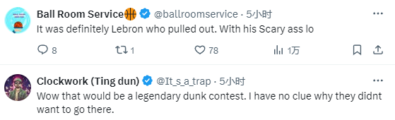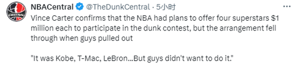2024年全明星周末的扣篮大赛又成为鸡肋,不过联盟曾想打造一届众星云集的扣篮大赛;卡特在节目中透露,联盟曾经想举办一次扣篮大赛,邀请了科比、麦迪、詹姆斯、我还有另外几个人,每人给100万美元奖金,让我们共同参加。但由于球员们退出,这个计划泡汤了,大伙没有人想去。