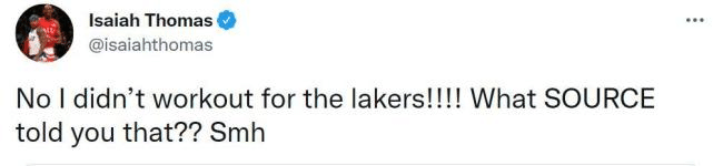 来源:JRS直播网09-18 11:00JRS直播网09月18日据NBA名记Michael Scotto报道,湖人试训了多位自由球员,其中包括沙巴兹-穆罕默德、杰里米-兰姆、德维恩-培根、米耶-奥尼、小托马斯、阿莫尼-布鲁克斯、沙里夫-库珀和米查尔-穆尔德。毫无疑问,两届全明星小托马斯是名气最大的球员,穆尔德是勇士旧将,兰姆的实力也很出色。小托马斯第一时间辟谣,表示自己并未为湖人试训。他写道:“不,我没有为湖人试训!!!哪个消息源告诉你的?”