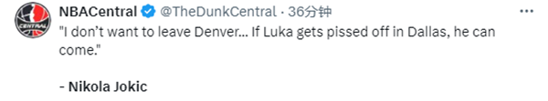 近日记者问约基奇,有没有一种可能,他和东契奇未来能同队?约基奇表示:我不知道,有可能吧。我不想离开掘金,这球队很棒,我喜欢丹佛。但如果东契奇哪天在独行侠生气了,他可以来掘金。