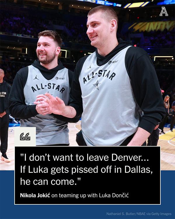 约基奇涉嫌公开招募东契奇:我不想离开丹佛但卢卡可以来掘金