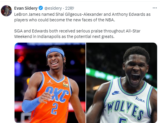 来源:JRS直播网02-19 12:37JRS直播网02月19日讯 ,詹姆斯公开回应谁是NBA未来接班人的话题,直言当他和杜兰特库里退役后,看好亚历山大和爱德华兹传递火炬。