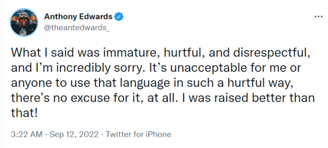 目前,爱德华兹已经删除了那段在社媒上引起热议的视频,随后在社媒上写道:“我所说的话不成熟,伤人,不尊重他人,我非常抱歉,无论是我还是其他任何人,以如此伤人的方式使用那些语言,都是不可接受的。总之,没有任何借口……”