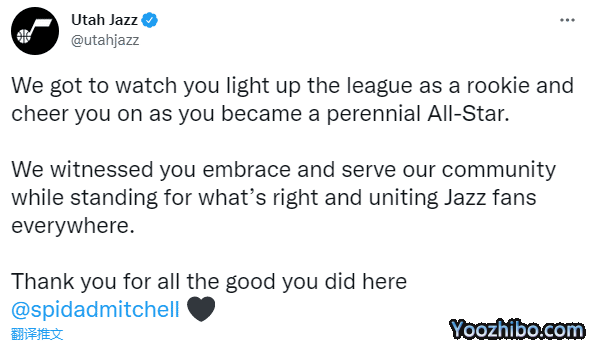爵士正式向米切尔告别,爵士官方晒出米切尔集锦,配文写道:在犹他永远都会有米切尔的球迷,曾经是爵士人,永远都是爵士人;爵士官推还写道:我们看到了你作为新秀点亮联盟,并在你成为全明星时为你加油。 我们见证了您拥抱并服务于我们的社区,同时坚持正义并且团结世界各地的爵士球迷。 谢谢你在这里所做的一切。