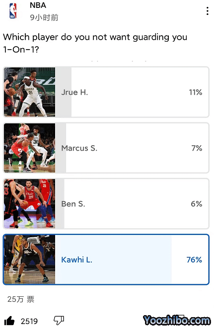 来源:JRS直播网09-03 16:13JRS直播网09月03日讯 近日,NBA官方发起投票,票选“你最不想和谁1V1?”给出了4个选项,分别是霍乐迪、斯玛特、本-西蒙斯和莱昂纳德,这4人都是NBA最顶级的防守球员。这项投票也吸引了超过25万球迷的参与,很显然第一名属于莱昂纳德,他占据压倒性的优势。