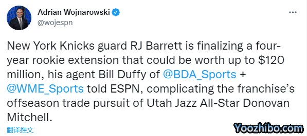 沃纳罗斯基还表示,巴雷特的续约会让米切尔与尼克斯的交易情况变得更加复杂;尼克斯方面要求爵士在周一晚前就多诺万-米切尔的交易做出表态,否则尼克斯将执行与RJ-巴雷特的续约合同。尼克斯和爵士近日在有关米切尔的交易谈话中缩小了双方的分歧,但交易仍无实质进展;巴雷特续约让米切尔交易更加复杂,若交易中没有巴雷特,爵士将要求尼克斯搭上更多的选秀权。