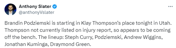 据勇士记者报道,波杰姆斯基将顶替克莱-汤普森进入首发。汤普森目前没有出现在伤病报告中,所以看起来是替补出场,勇士战爵士的首发阵容是库里、波杰姆斯基、维金斯、库明加和追梦格林。