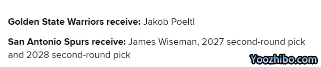 来源:JRS直播网08-25 20:40JRS直播网08月25日讯 随着杜兰特逼宫闹剧的结束,联盟还会有什么交易发生吗?北京时间8月25日,美媒Bleacher Report支招勇士3换1升级内线,来提升新赛季卫冕的概率。具体方案是勇士说送出怀斯曼、2027年次轮签和2028年次轮签,得到马刺中锋珀尔特尔。